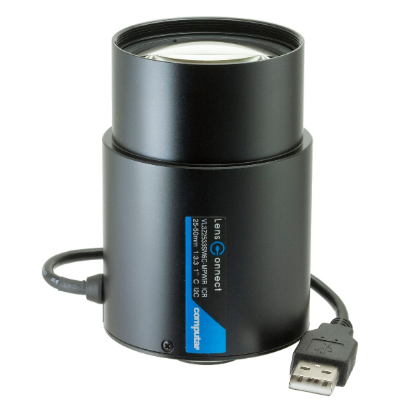 The Computar LensConnect VL2Z2533UM6C-MPWIR C-mount lens features a varifocal 25-50mm focal length, f3.3 fstop, 1", 9 MP lens. LensConnect motorized lenses are powered with a USB cable to provide remote control of zoom, focus, and iris adjustments that can easily be made with the Plug-and-Play software. The floating focus design enables ultra-high near to far resolution. Precise focus adjustments can be made with the stepper motor to ensure consistent results. The LensConnect lens series includes fixed or varifocal lenses.