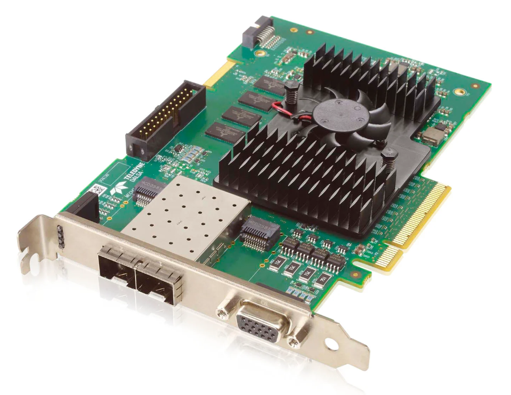 The Teledyne Dalsa Xtium2-XGV Dual frame grabber is a 2 port, 10GigE image acquisition board that outputs data with a 10GigE, 5GigE, 2.5GigE, or 1GigE Ethernet link, and is GigE Vision® V1.2 and 2.0 compliant. The half-length PCI Express™ Gen 3.0 x8 board can maintain an input bandwidth of up to 4 GByte/s (4x10 Gbs) and transmit image data to the host memory at up to 6.8 GBytes/sec.