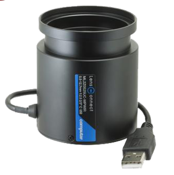 The Computar LensConnect ML2Z0525UC-MPWIR C-mount lens features a varifocal 5.5-12.7mm focal length, f2.5 fstop, 1", 9 MP lens. LensConnect motorized lenses are powered with a USB cable to provide remote control of zoom, focus, and iris adjustments that can easily be made with the Plug-and-Play software. The floating focus design enables ultra-high near to far resolution. Precise focus adjustments can be made with the stepper motor to ensure consistent results. The LensConnect lens series includes fixed or varifocal lenses.