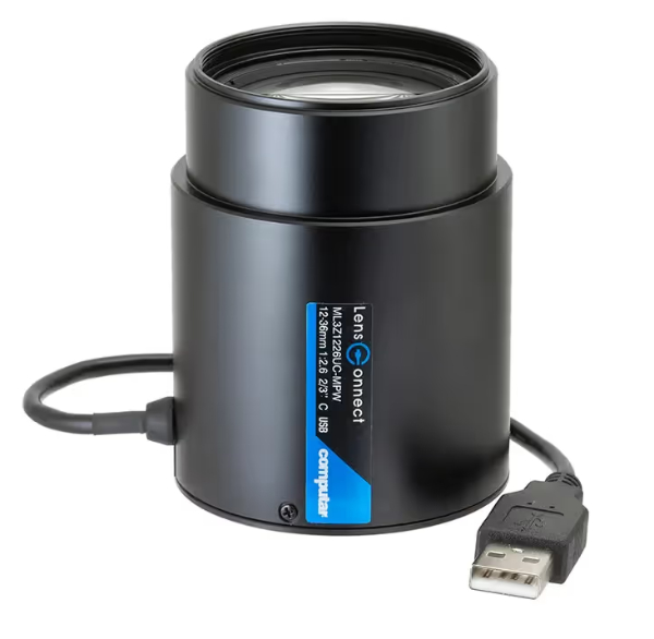 The Computar LensConnect ML3Z1226UC-MPW C-mount lens features a varifocal 12-36mm focal length, f2.6 fstop, 1", 9 MP lens. LensConnect motorized lenses are powered with a USB cable to provide remote control of zoom, focus, and iris adjustments that can easily be made with the Plug-and-Play software. The floating focus design enables ultra-high near to far resolution. Precise focus adjustments can be made with the stepper motor to ensure consistent results. The LensConnect lens series includes fixed or varifocal lenses.