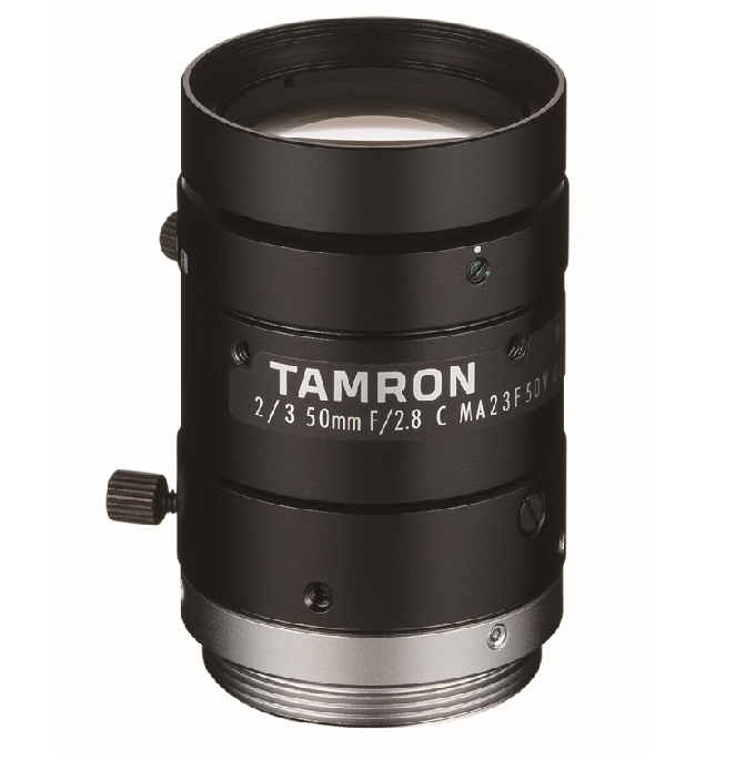 The Tamron MA23F 2/3" 8MP Series Lens family features for up to 2/3" sensor sizes, optimized for down to 2.74µm pixel pitch (8mp), 8mp resolution rating, very close working distance (mod), very low distortion, screw locks, click stop iris.
