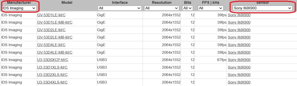 The image below is an annotated screenshot, where the manufacturer (IDS) and the sensor (Sony IMX900) bring you to the 10 distinct camera models utilizing this sensor.