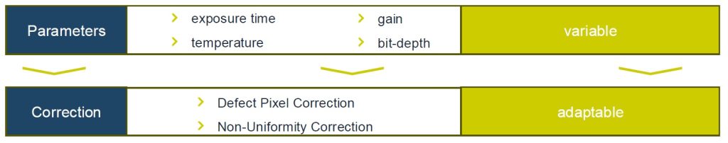 Factory configuration of each camera, before finalizing testing and shipping, adapts for the nuanced differences among individual sensors. Correction tables are created and stored onboard the camera, so that the user receives a camera that already compensates for the variations.